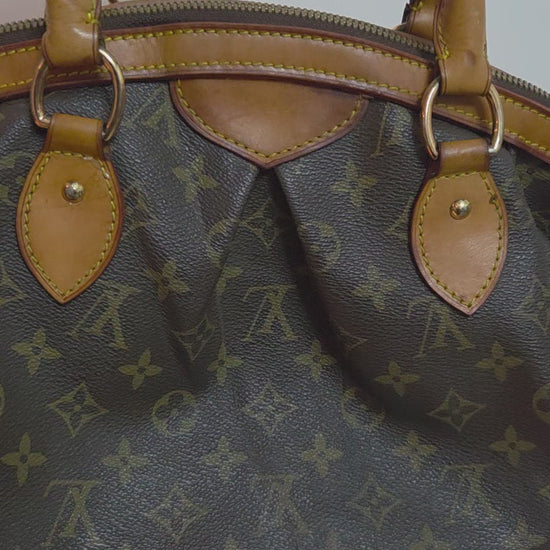 Chic preloved monogram handbag featuring brown leather handles and gold-tone hardware.
